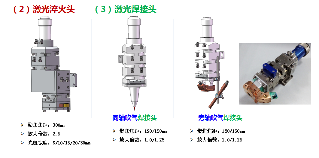 公司自主研发的加工头可用于激光熔覆、淬火、焊接及激光清洗等领域,外挂式水冷,模块化结构设计,适用于各类机床及机器人,可承受最大功率5kW。采用消像差光学设计,保证焦点位置及大小恒定。
